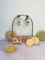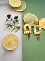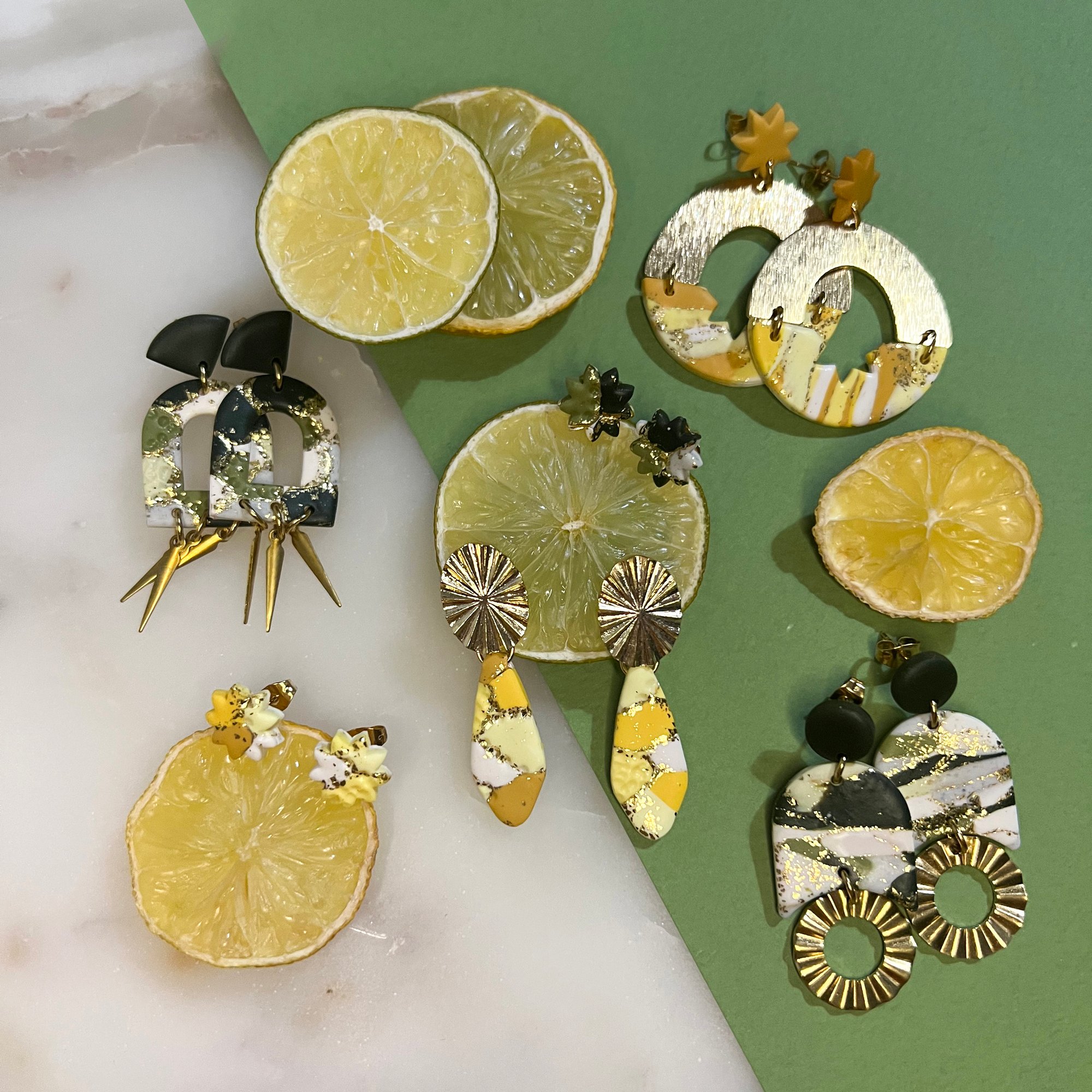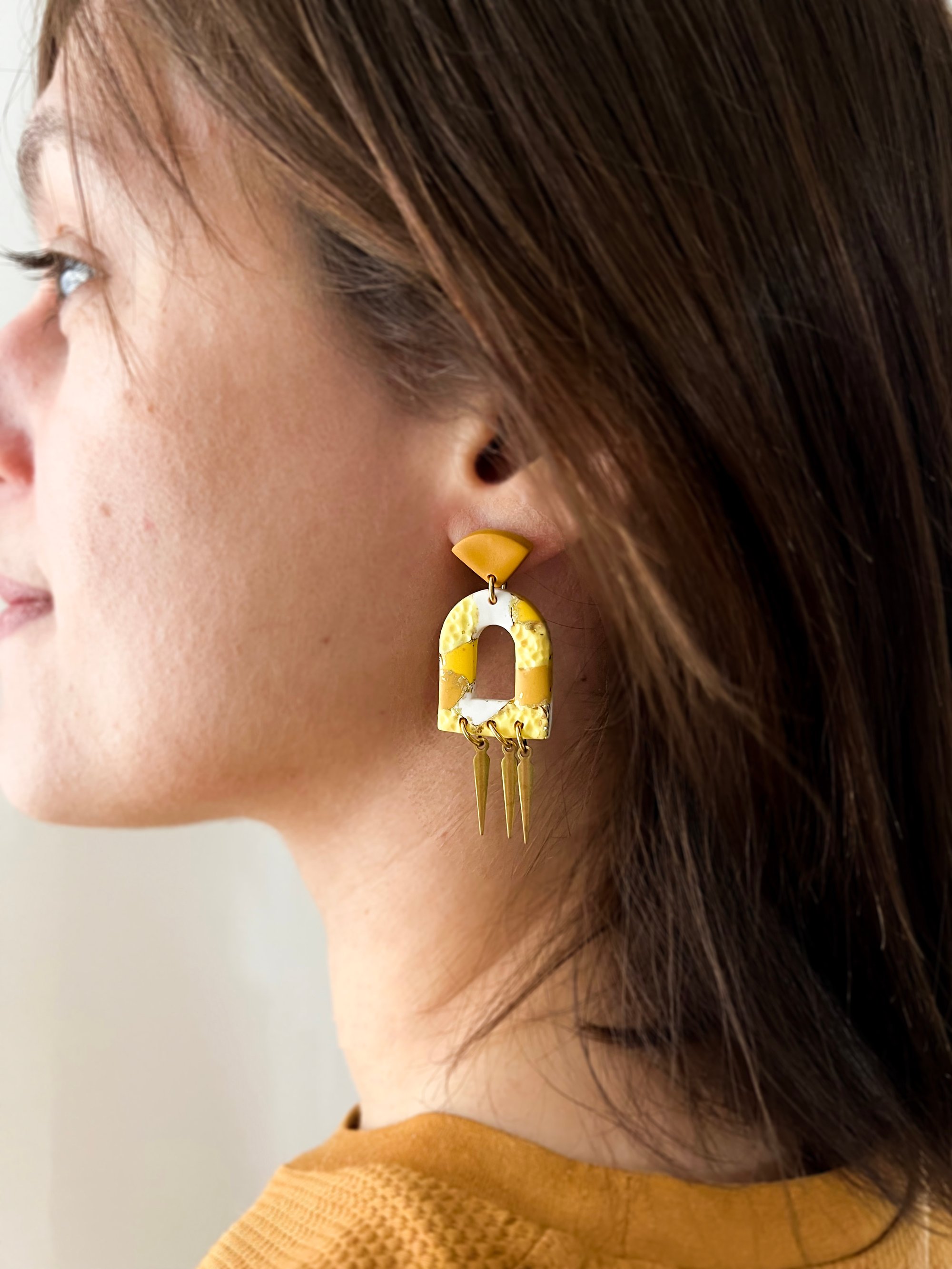 Boucles en argile polymère, laiton doré et acier inoxydable.