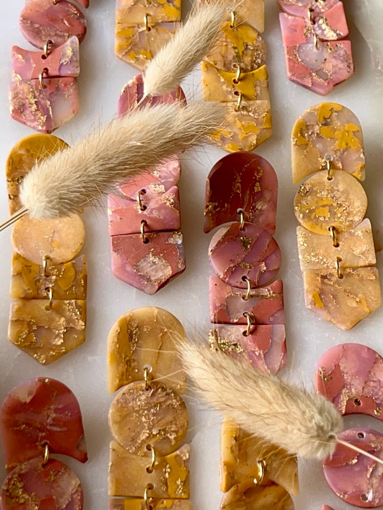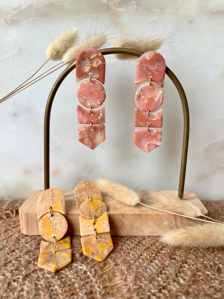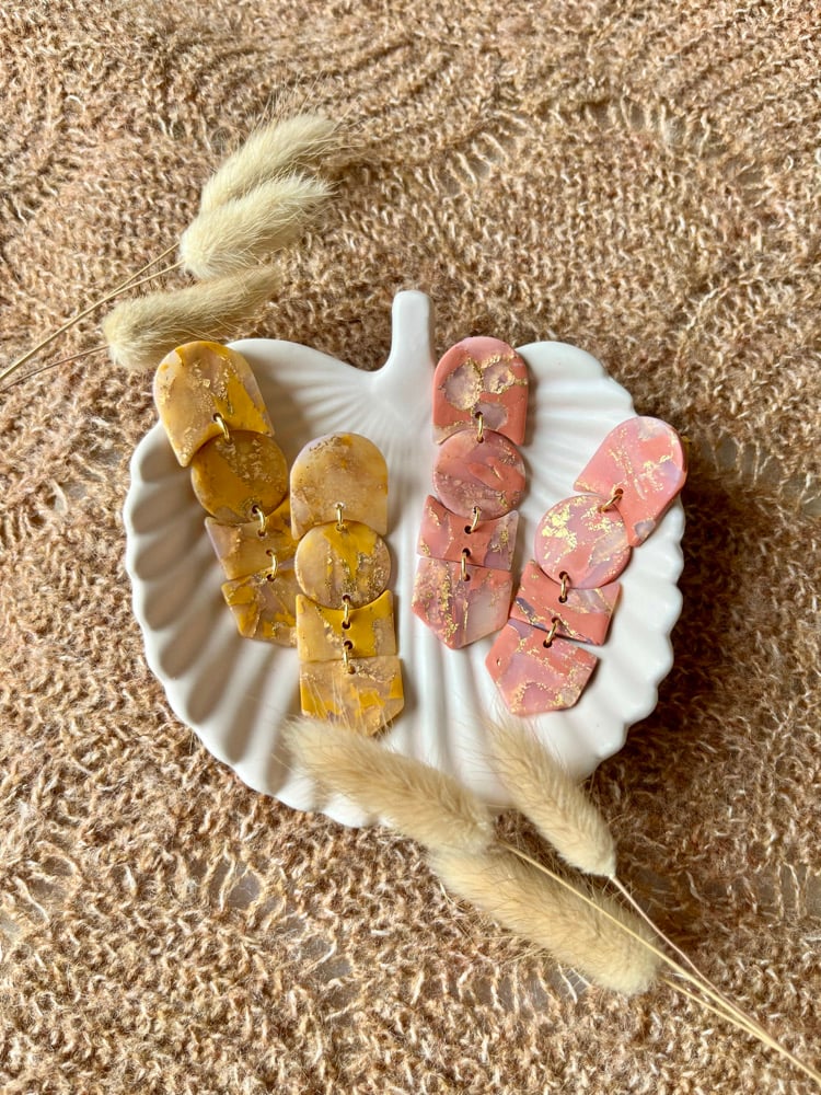 Boucles en argile polymère, feuille d'or et anneaux en laiton doré à l'or 24K.