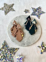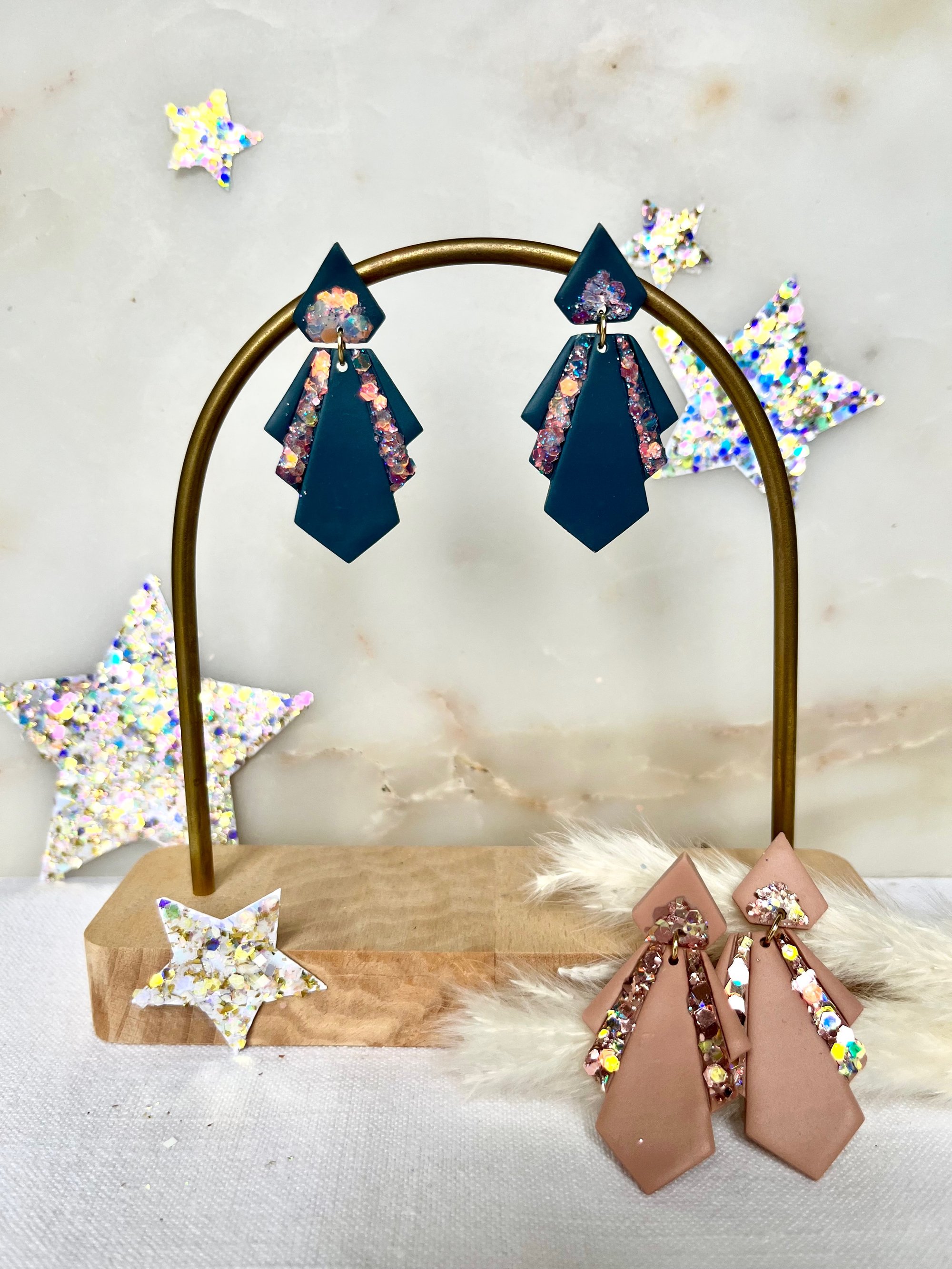 Boucles en argile polymère, paillettes et acier inoxydable.
