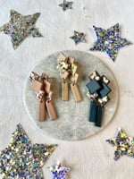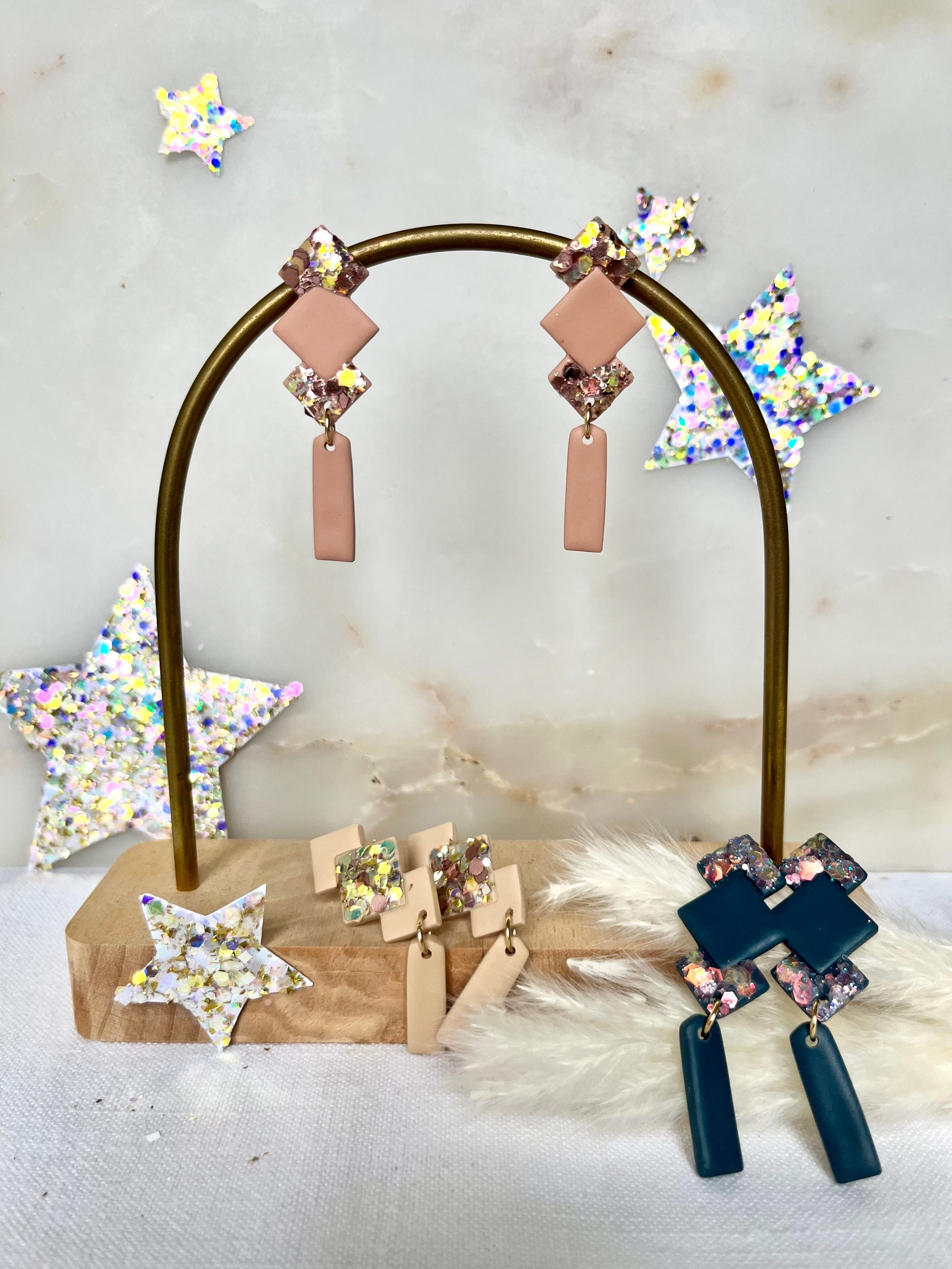 Boucles en argile polymère, paillettes et acier inoxydable.