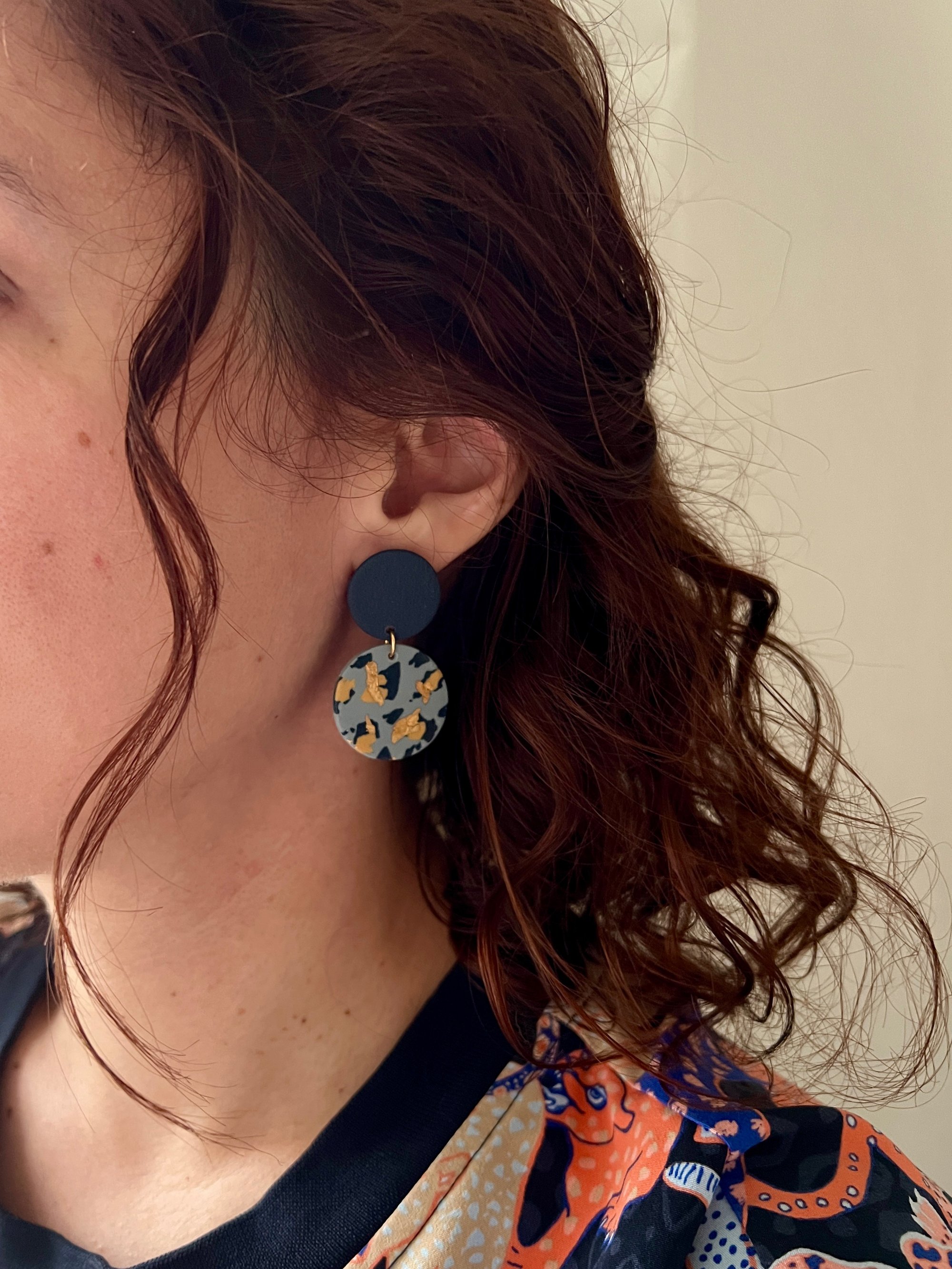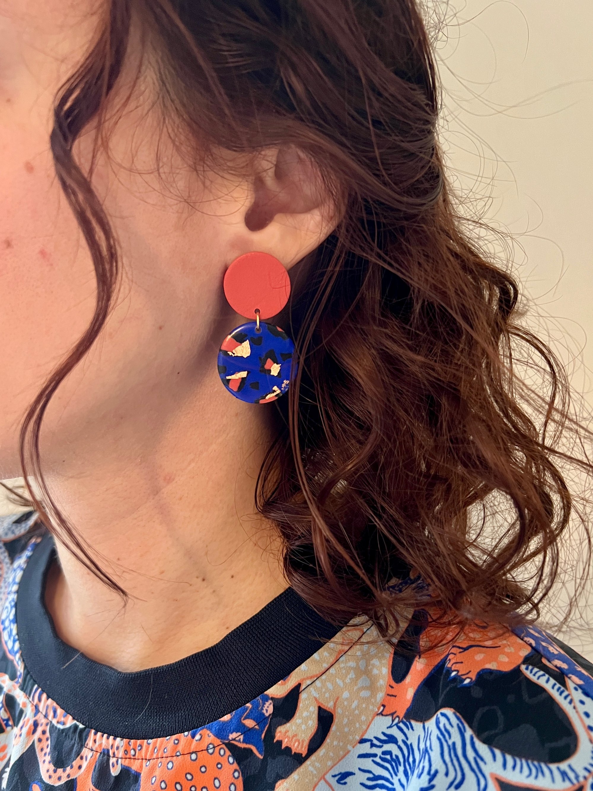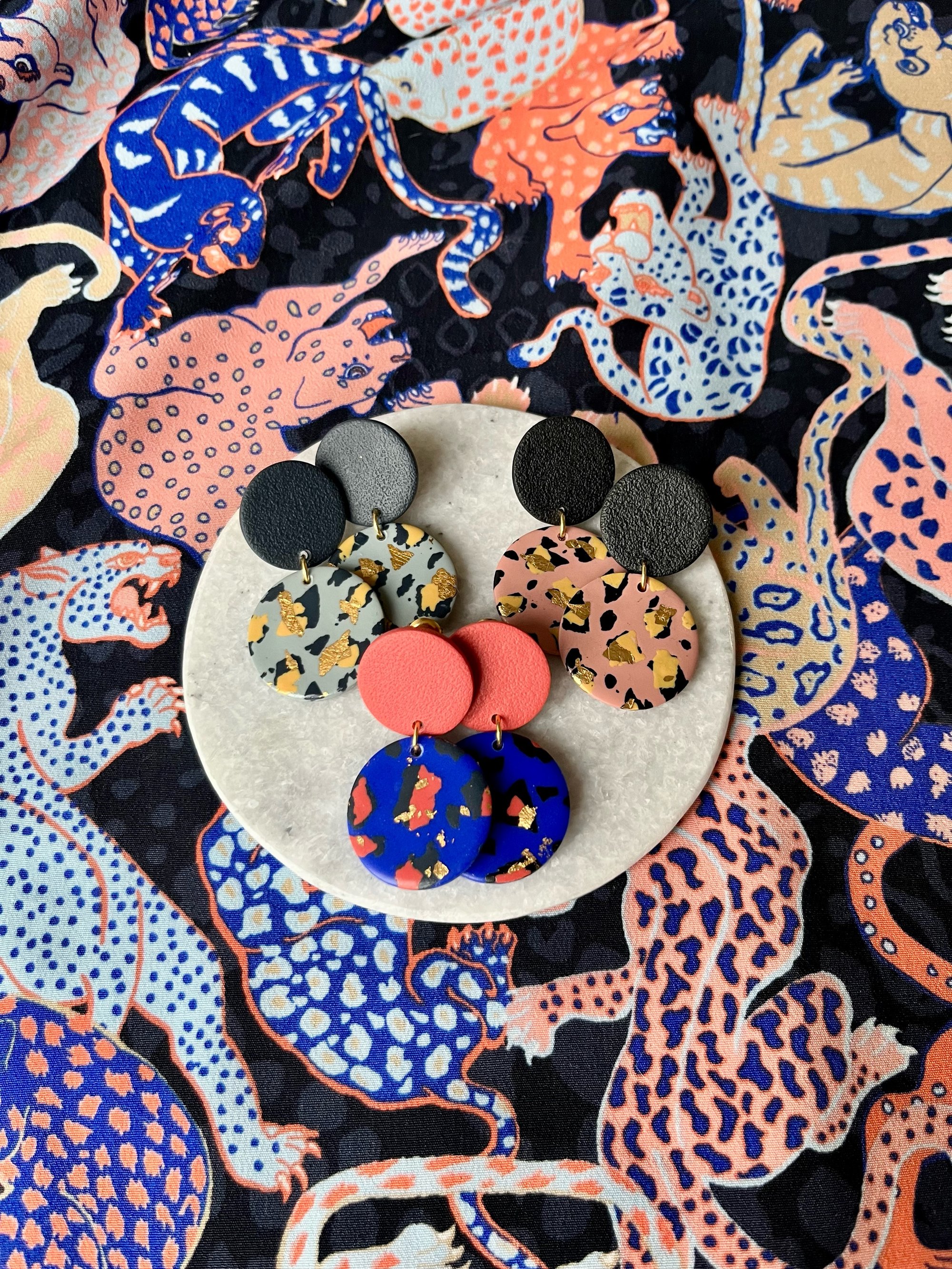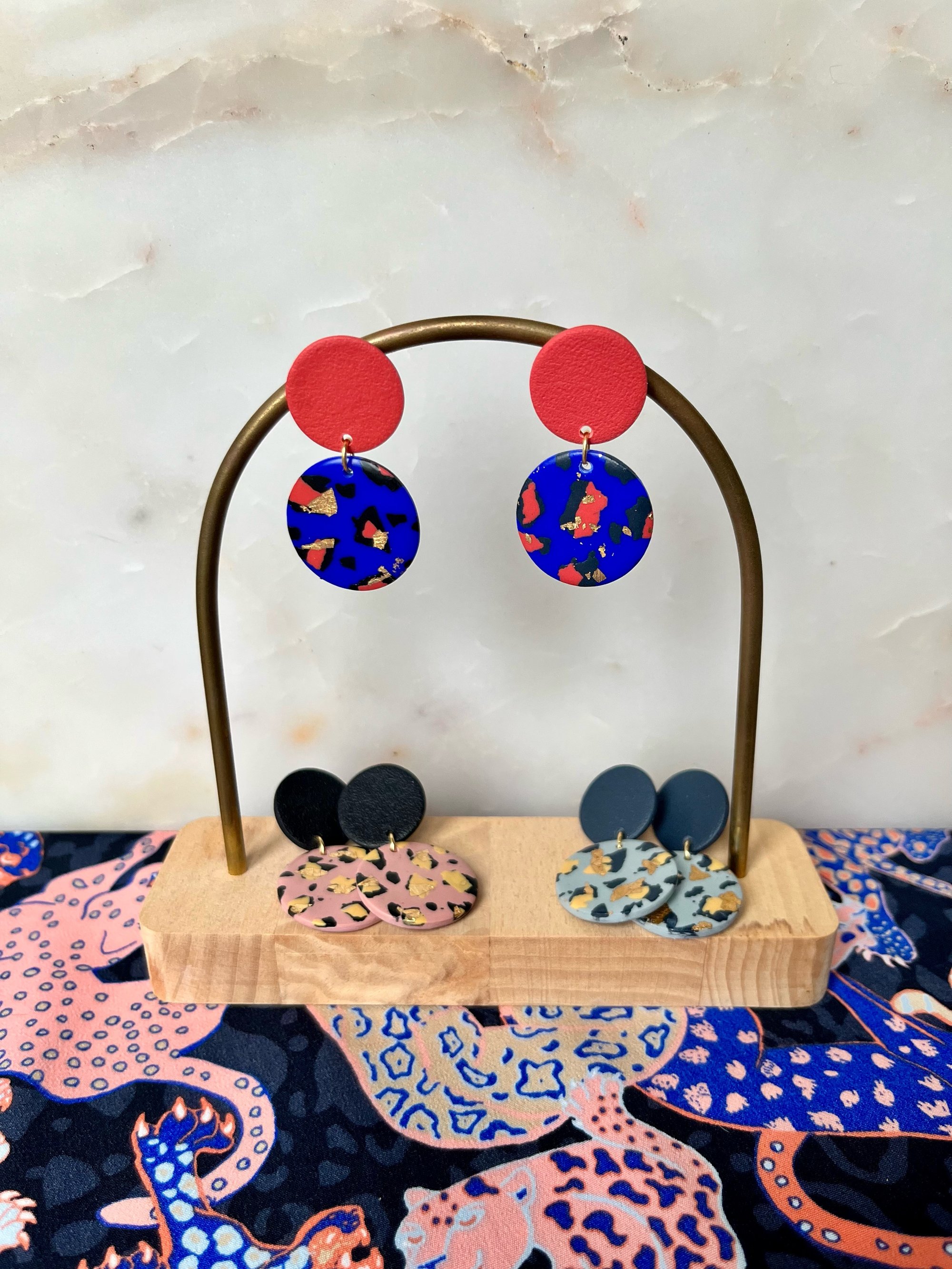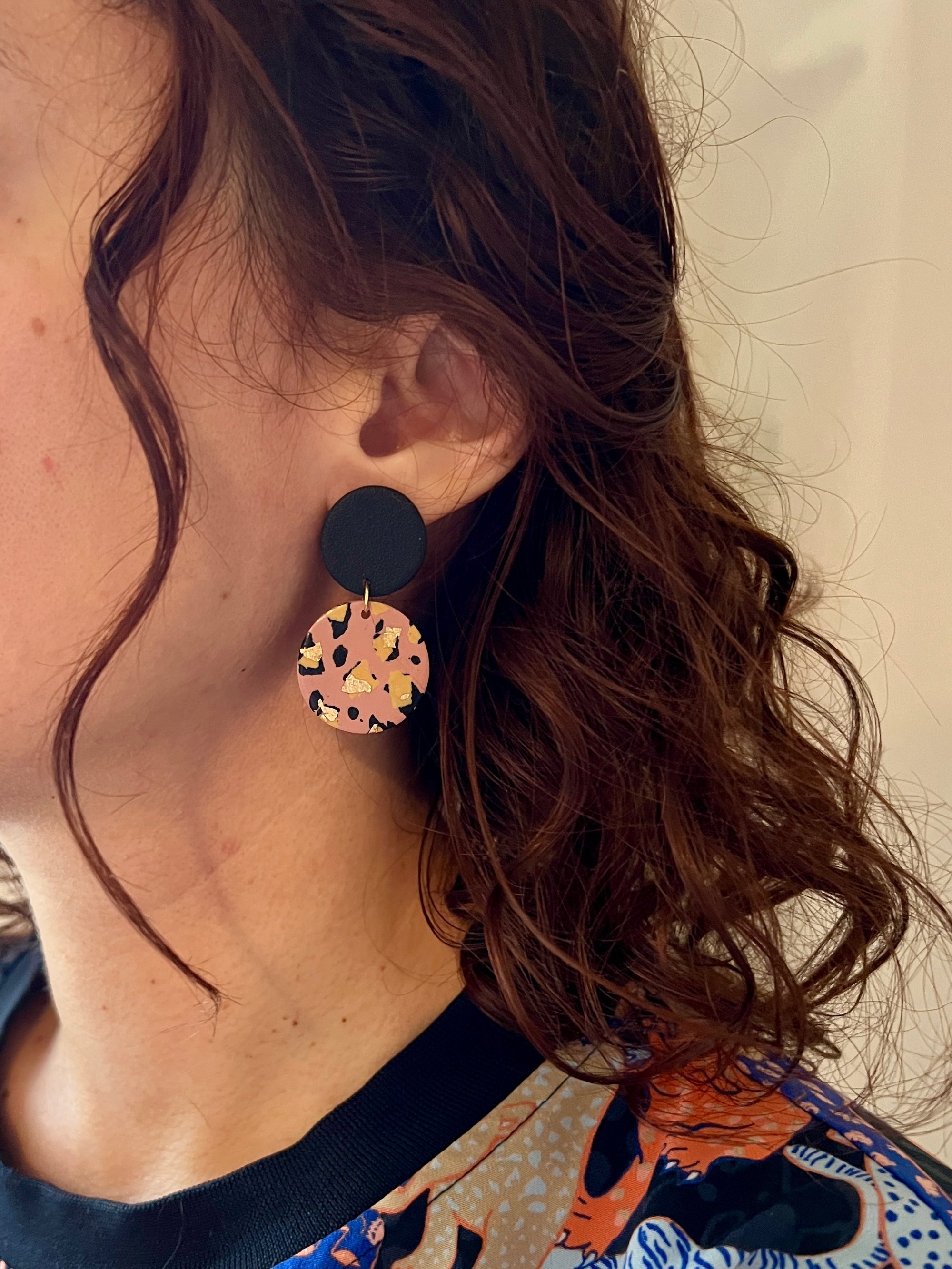 Boucles en argile polymère, feuille d'or et acier inoxydable.