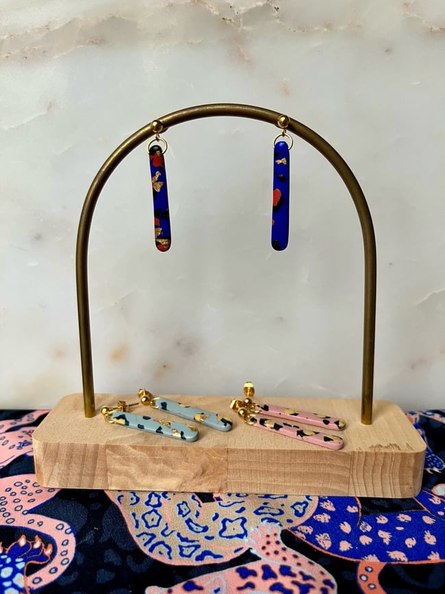 Boucles en argile polymère, feuille d'or et acier inoxydable.