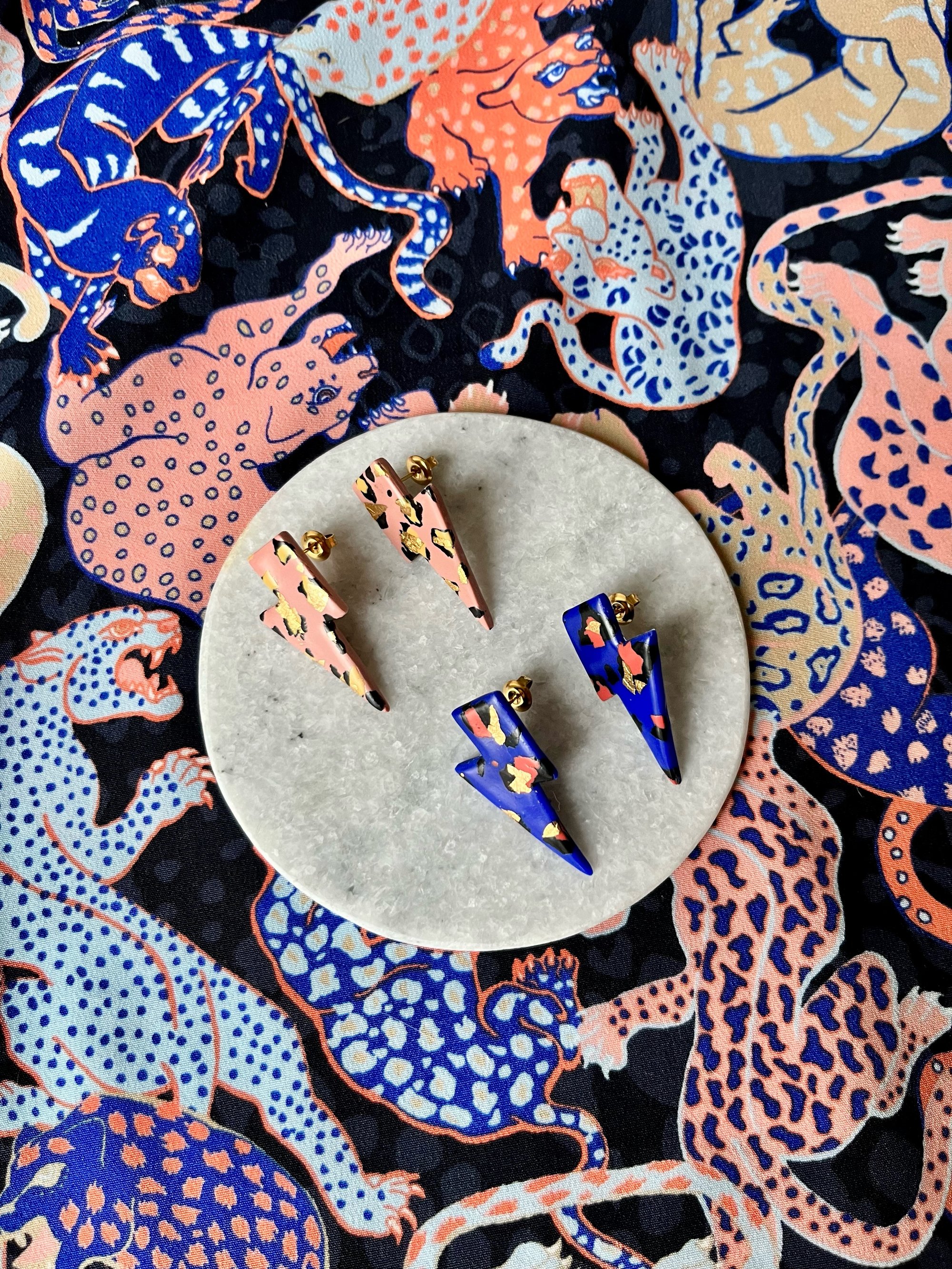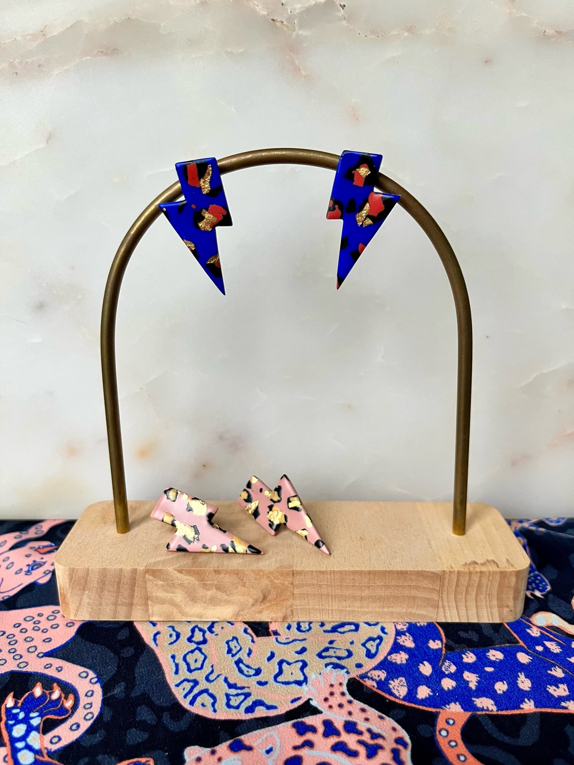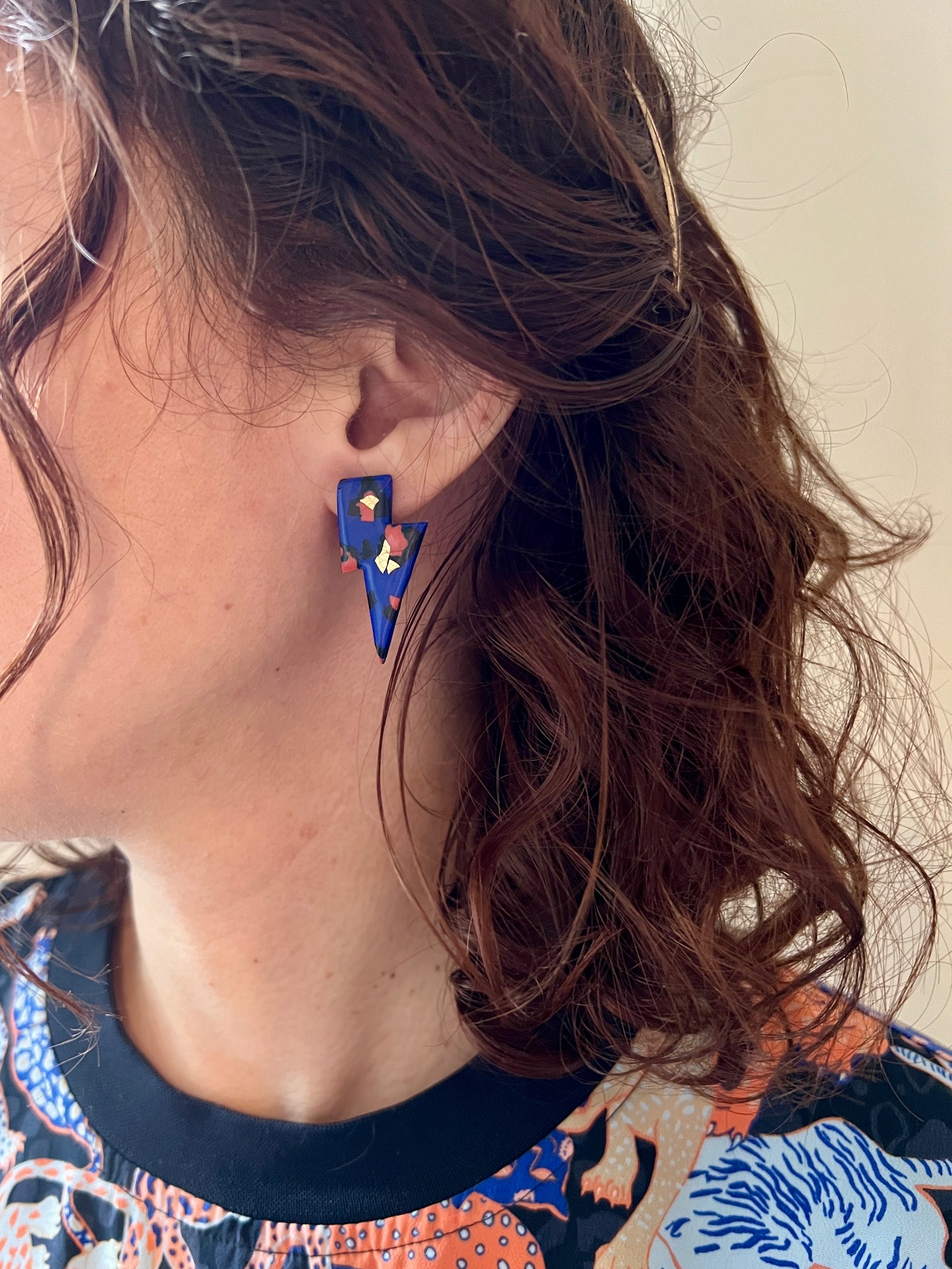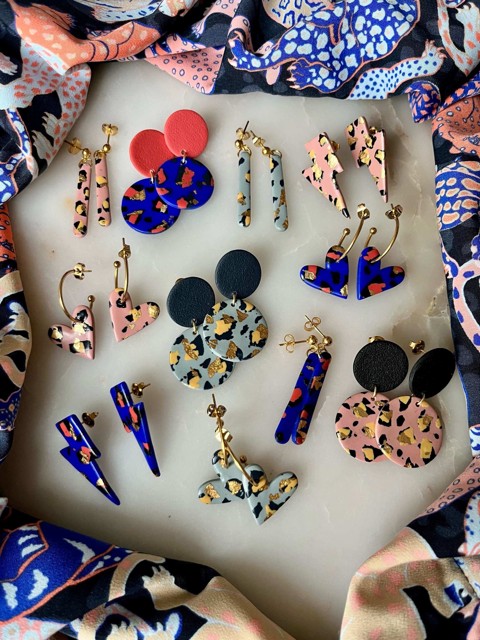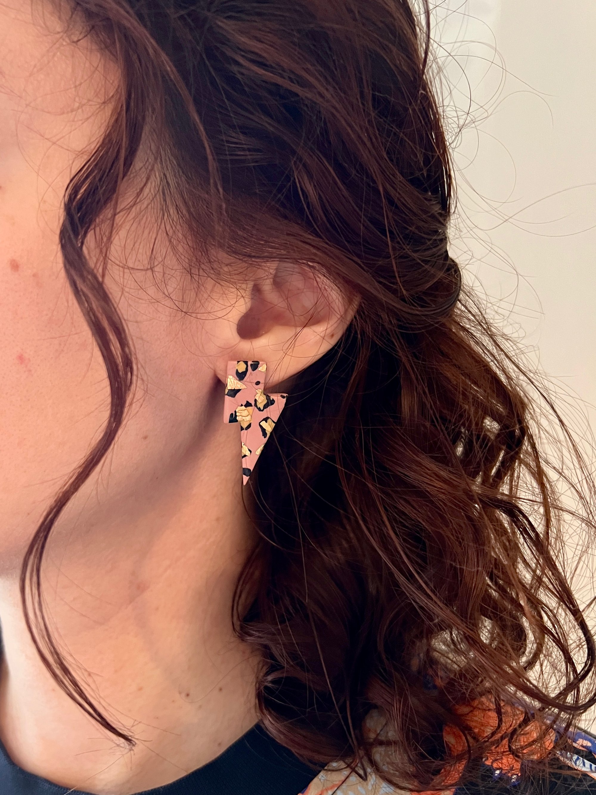 Boucles en argile polymère, feuille d'or et acier inoxydable.