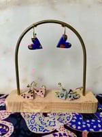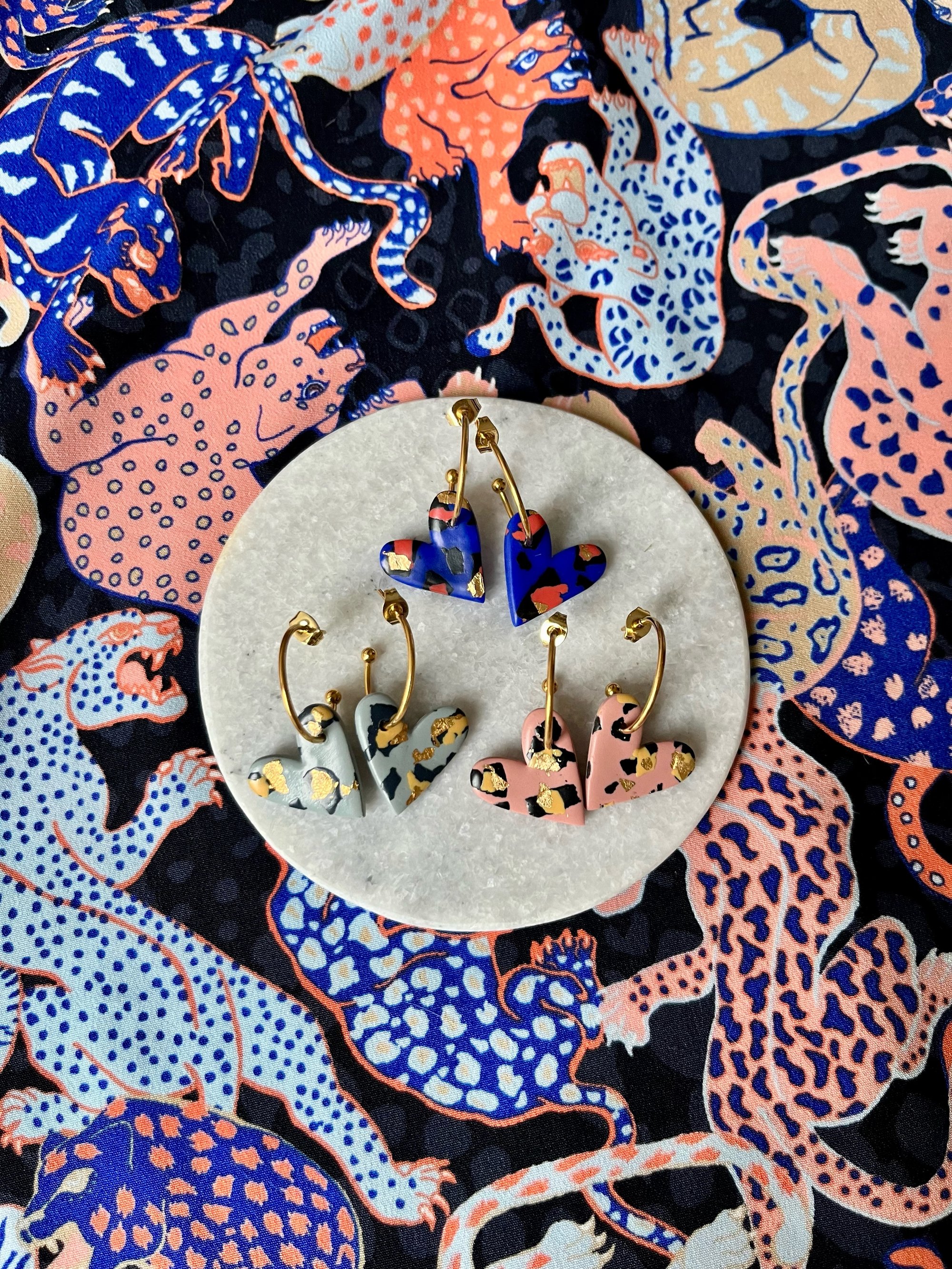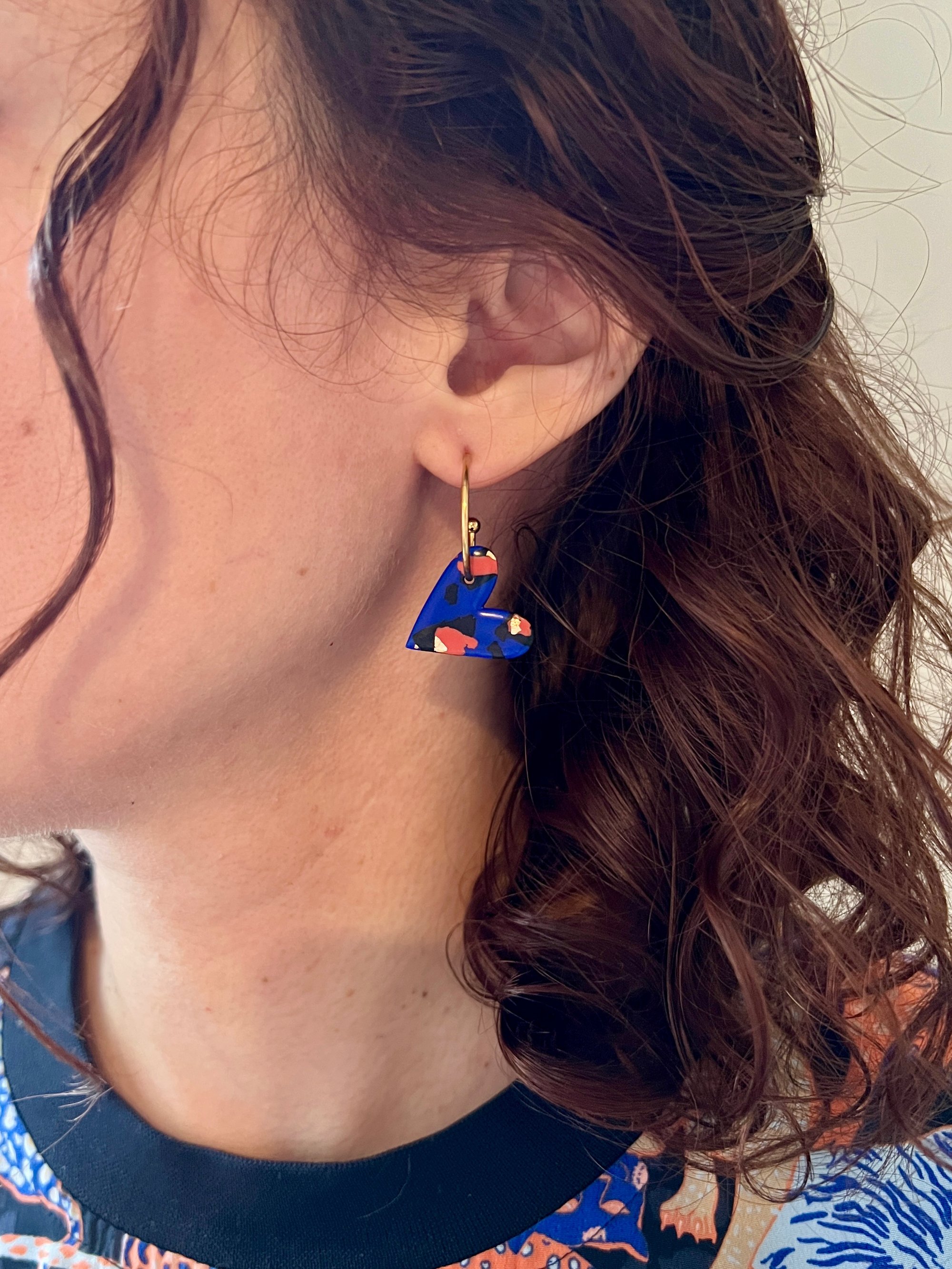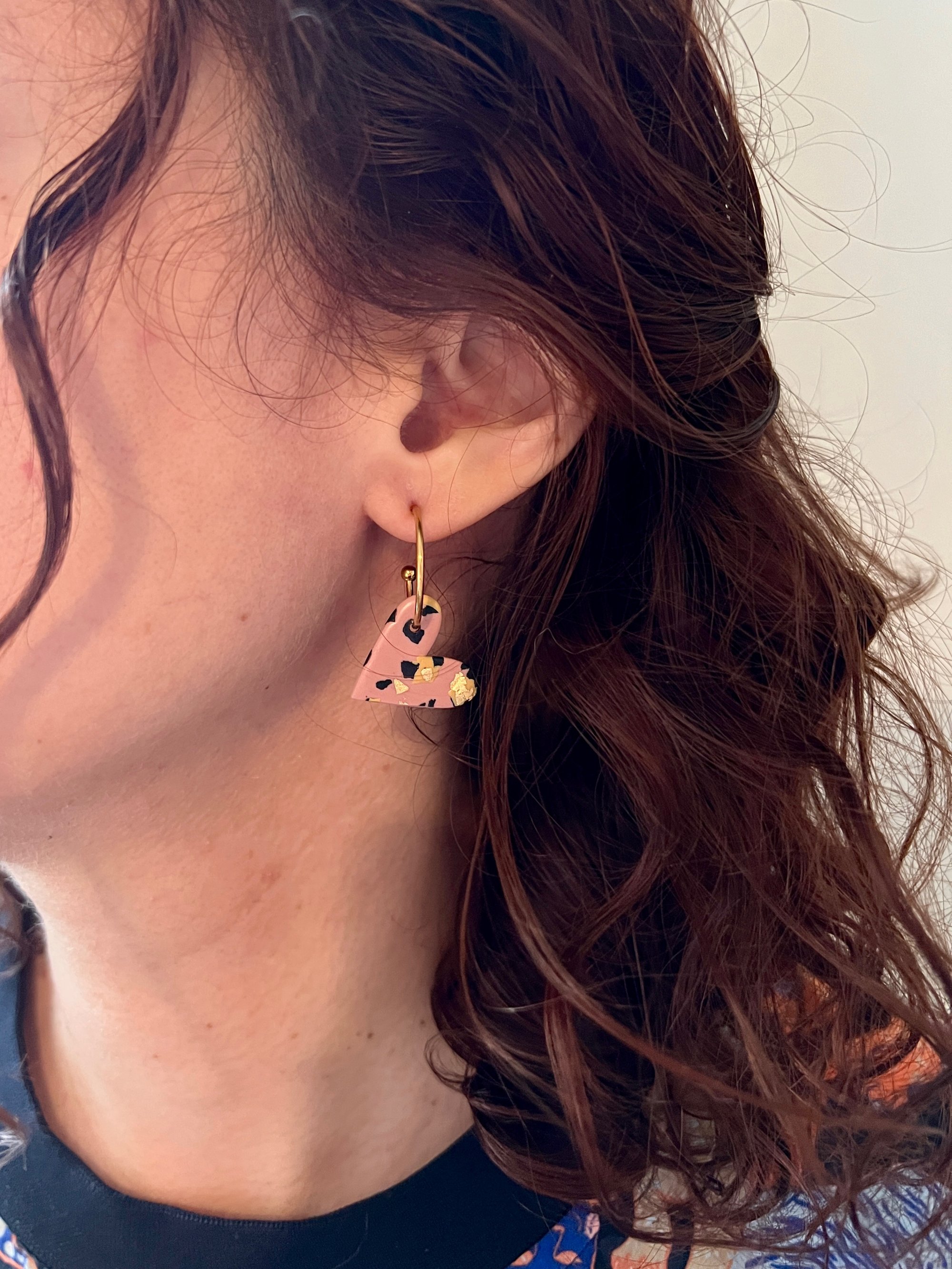 Boucles en argile polymère, feuille d'or et acier inoxydable.